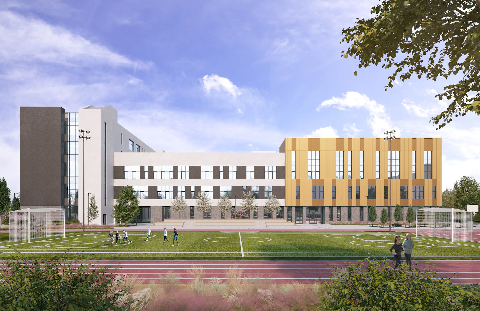 Особое внимание в проекте уделено спортивной зоне: предусматриваются футбольное поле, спортзалы, зоны для сдачи нормативов, ямы для прыжков с песком, полосы препятствий. Кроме того, во дворе школы построят большой амфитеатр.